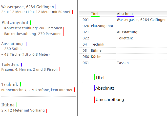 In der nachstehenden Abbildung ist links beispielhaft ein Raum beschrieben und rechts die dazugehörige Übersichtsliste.